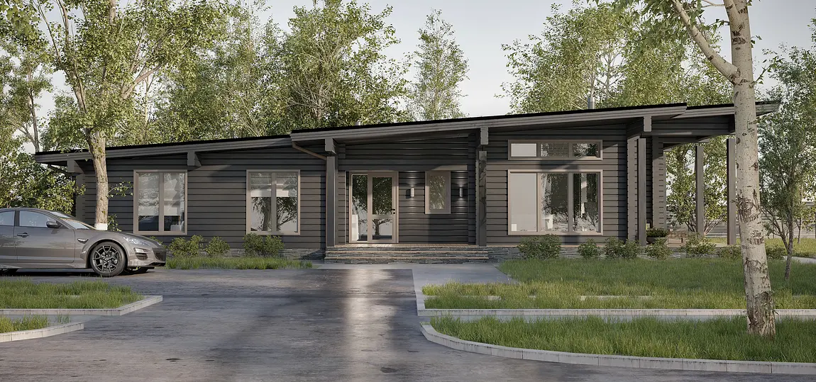 Некоторые скажут, что минимализм и деревянные технологии - это не возможно или не сочитаемо. Данный проект наглядный пример современных тенденций. Горизонтальная разлиновка клееного бруса гармонично вписалась и дополнила данный стиль визуально вытянув строения в длинну. Уникальность функциональности заключается в кровле, высота которой постепенно увеличивается со стороны спального блока в сторону общественного (кухни-столовой-гостинной). Большие свесы защищают от осадков и воздействия ультрофиолета. Планировка делится на три независимые зоны: спальный блок, техническая зона и общественная. Обходная терраса не только увеличивает комфортное пространство, но и благоприятно влияет на эстетическую составляющую.