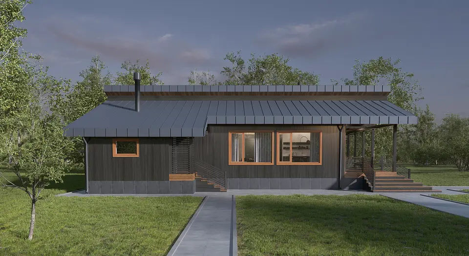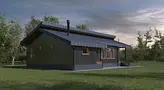 Планировочное решение обусловленно расположением на земельном участке и сторонами света, таким образом крыльцо пришлось совместить с террасой. Дом проектировался для постоянного проживания двух человек, но в нем предусмотренно пространство для работы и отдельная комната для размещения гостей. Как в лучших традициях Финляндии, строение содержит в себе парную с отдельным выходом через котельную. Цвет фасада и форма так же были выбраны в Скандинавском стиле.