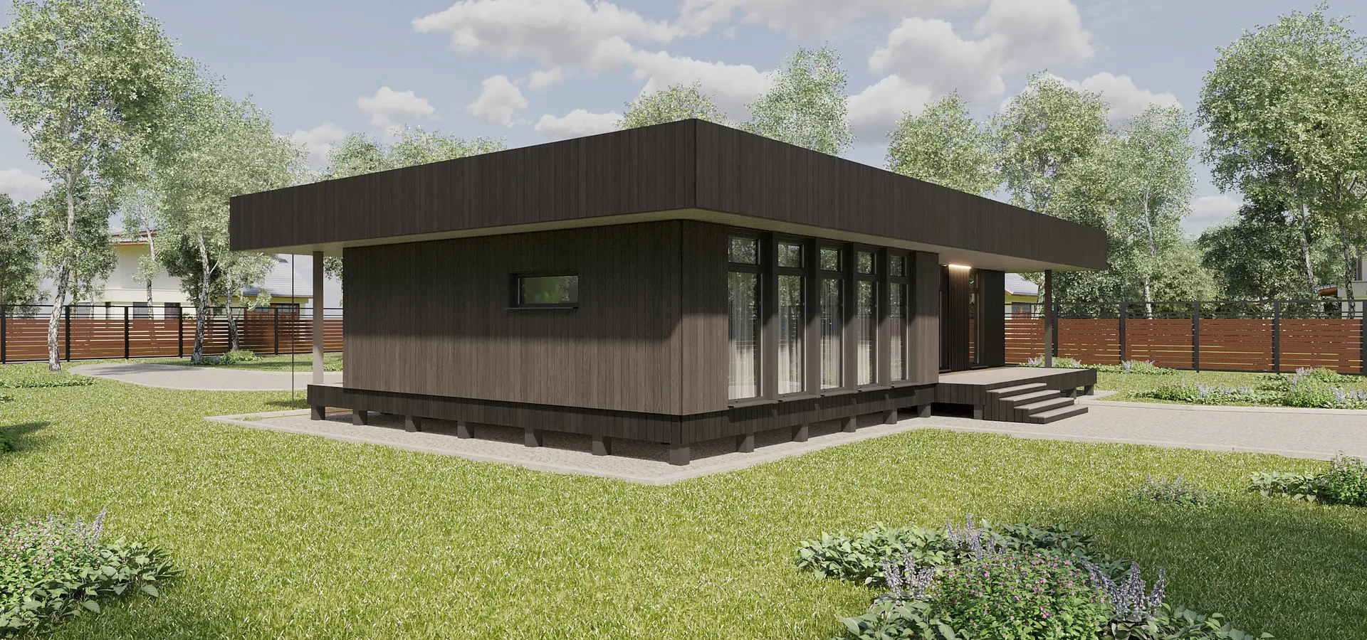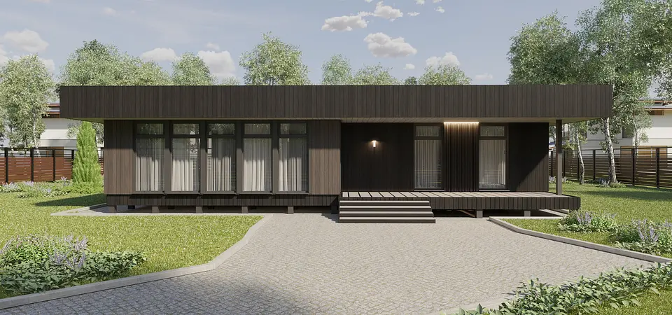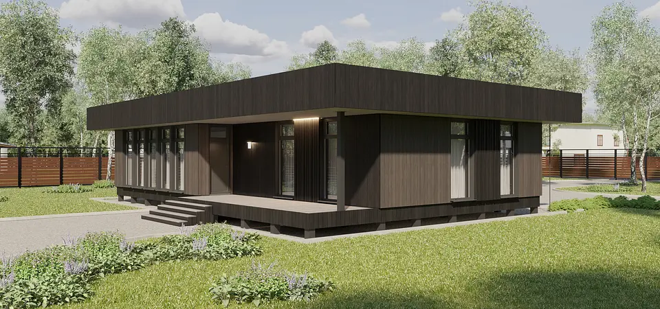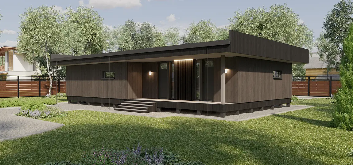 Проект был разработан по каркасной технологии для серийного строительства в Свердловской области. Задача состояла в создании оптимальной конструкции и уникального планировочного решения, которое подходило бы к большинству земельных участков благодаря возможности зеркального отображения (отзеркаливания). Архитектура решена в стиле хай-тек. Особенностью являются большие нависающие свесы по периметру дома, а кровля выполнена как односкатная, что повышает надежность и упрощает монтаж. Стоимость проекта фиксирована, и ее можно уточнить в компании «Разработки Урала».