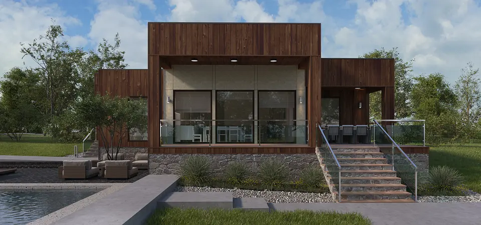 Дом разрабатывался в комплексе типовых проектов, с учетом отправки комплекта материалов в морском контейнере для строительства в Калифорнии. Уникальность строения заключается в его функциональности, оно включает в себя основной дом, СПА-зону и обходную террасу со сквозным проходным элементом объединяющую с входным крыльцом.