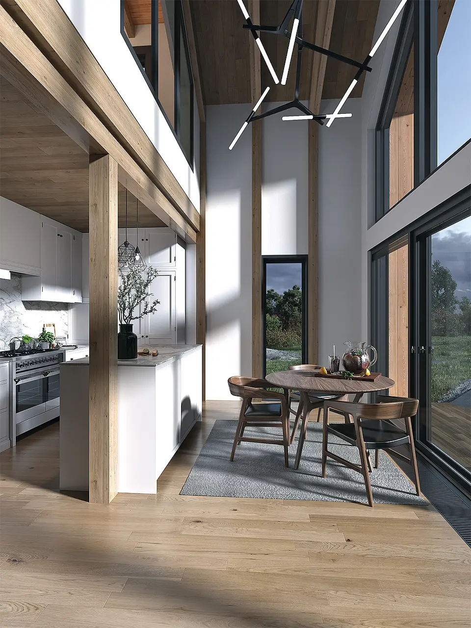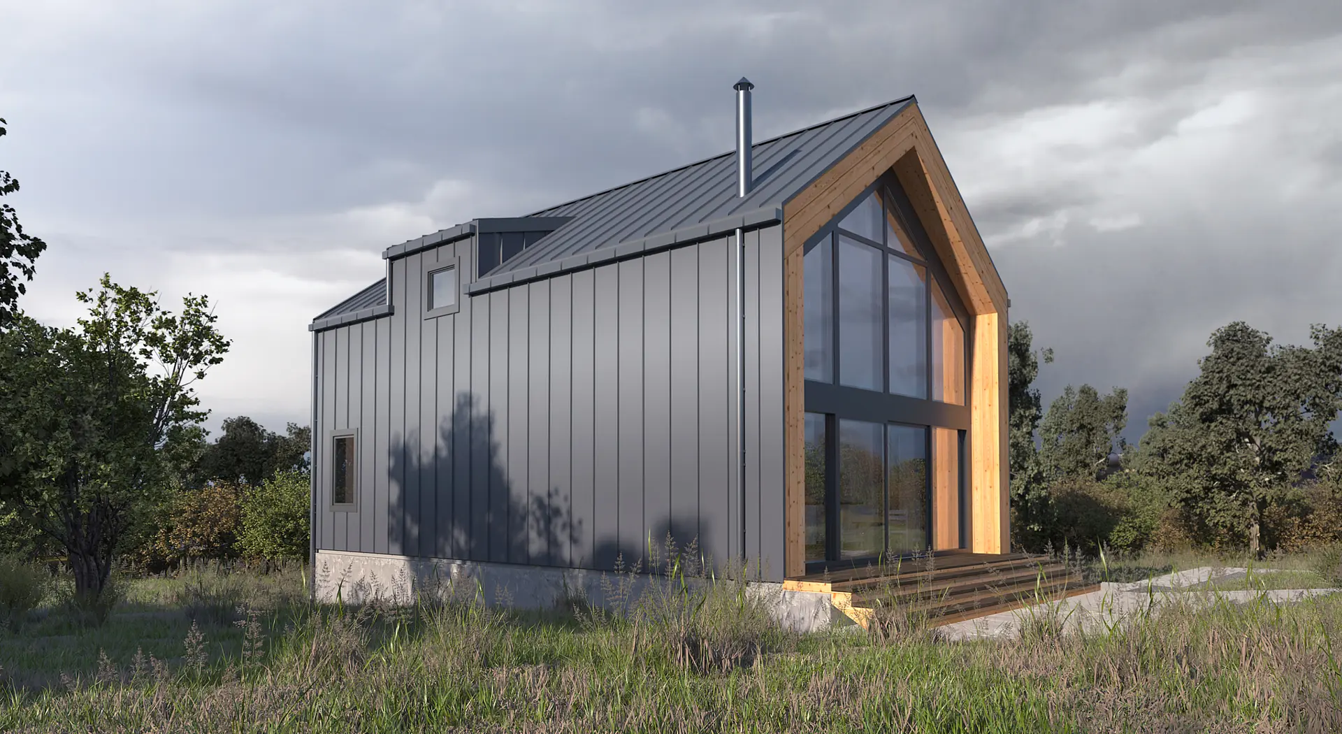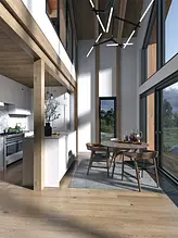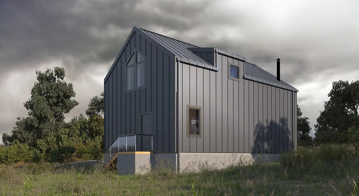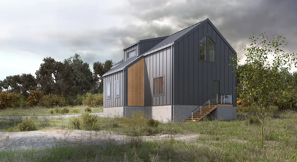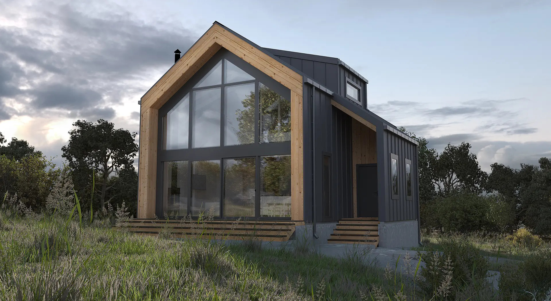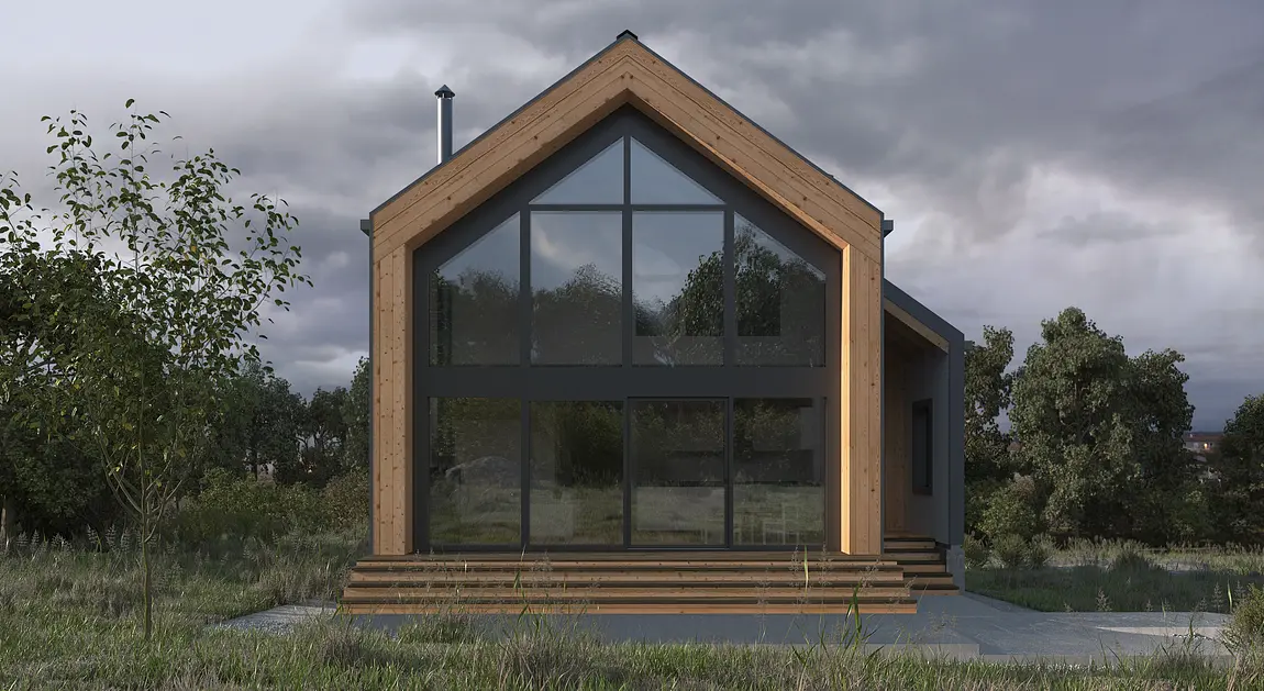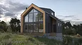 "Барн хаус" - это стиль, который уверенно занял свое место на рынке строительства во всех направлениях. В данном случае получилось сочетать идеальные пропорции, практичность и функциональность. Фасад состоит из комбинации металла и натурального дерева, а фишкой данного дома является огромный витраж, за которым расположилась гостинная-столовая-кухня со вторым светом. Присутствует еще один интересный архитектурный элемент - Дормер - это вертикальное окно, выступающее из наклонной плоскости кровли, которое служит для увеличения пространства в нужных местах и помещениях.
