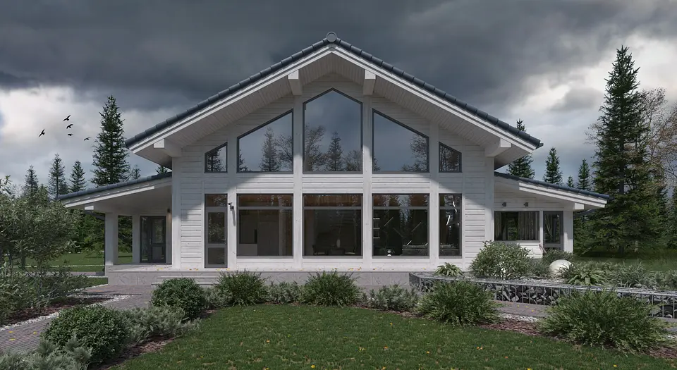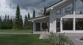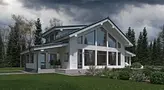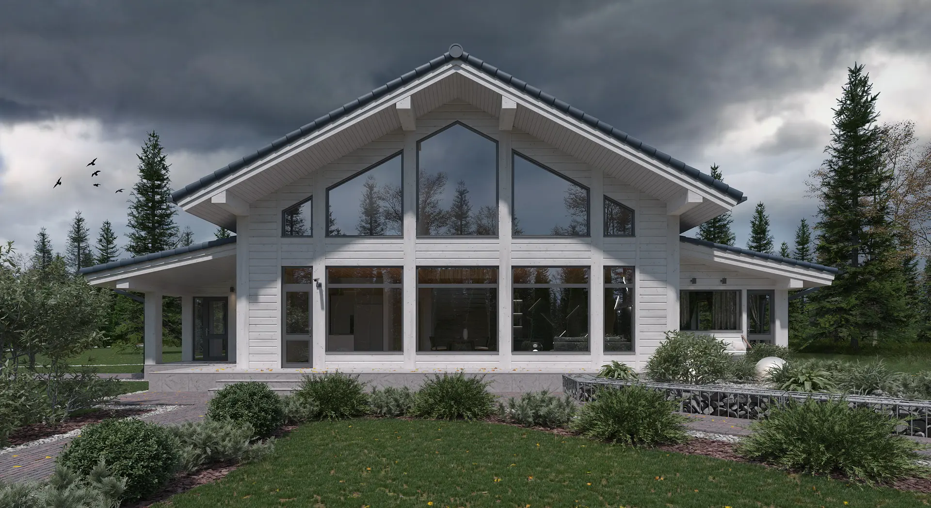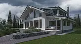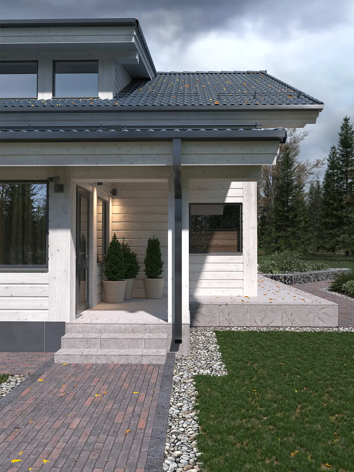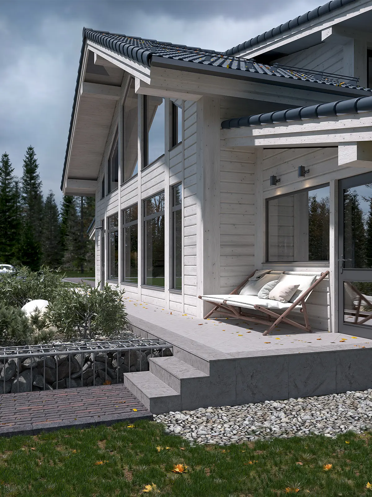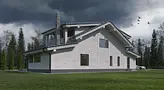 Скандинавская культура проникает в наш быт и жилую среду. Дом получился в лучших традициях северного региона Финляндии. Отличительной чертой является красивая входная группа и большая обходная терраса, которая соединяет крыльцо и зону барбекю. Благодаря этой тенденции мы и Заказчики начинаем смотреть на эргономику участка и внутреннего пространства дома по другому, становясь более открытыми. Не можем не отметить в доме присутствутствие 2ого света, который объеденяет два этажа и дает много света и пространства, совместно с панорамным остеклением.