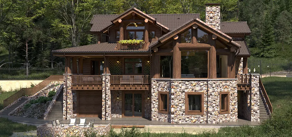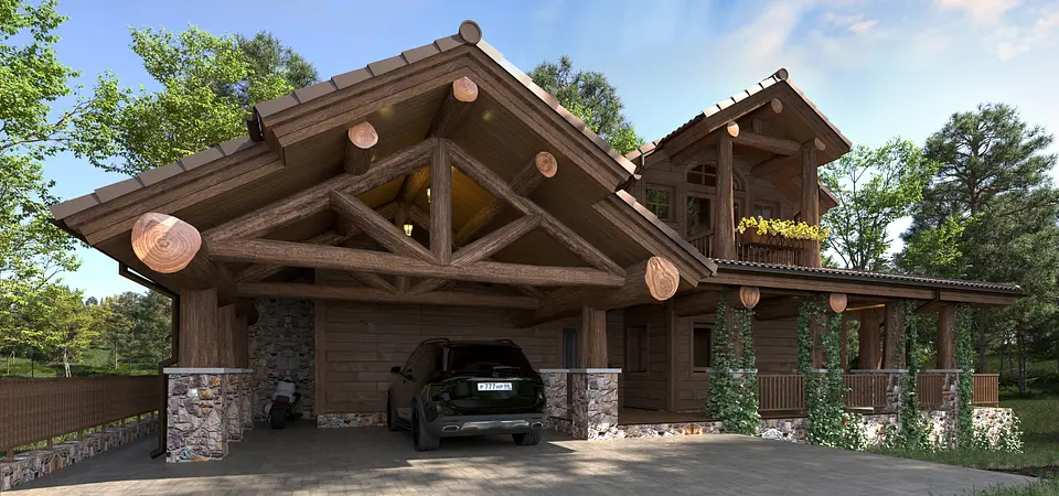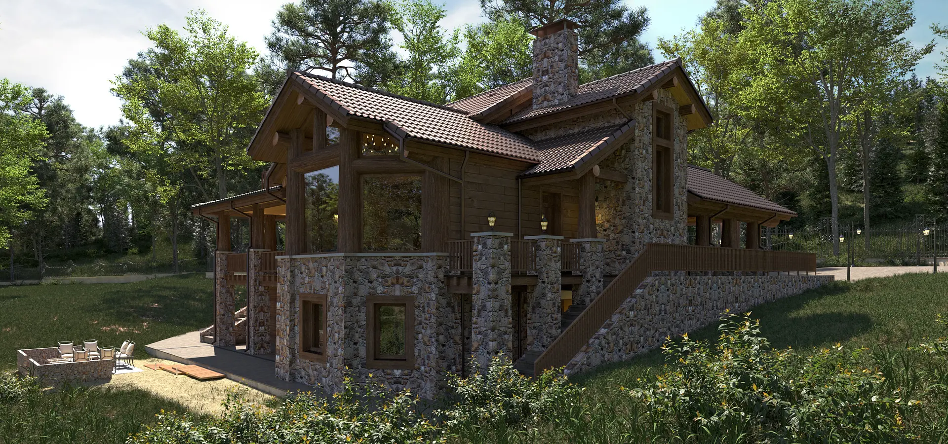 Очень редкий стил, называется "Американское шале". Прототип (аналог) был взят из провинции горной Канады. Дом распологается на крутом спуске к Мариинскому водохранилищу. Таким образом образовался цокольный этаж, в которо разместились технические зоны и спа комплекс. Из-за сложной конфикурации строения, пришлось применить большое сочетание строительных технологий: монолит, блок, каркас и Post & Beam.