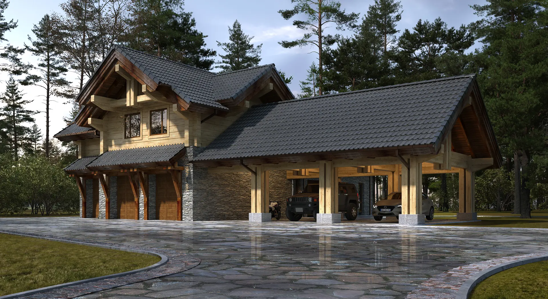 Для автомобилей гостей и хозяев предусмотрены места под большим навесом и в теплом гараже, а обслуживающий персонал проживает на втором этаже гаража.
