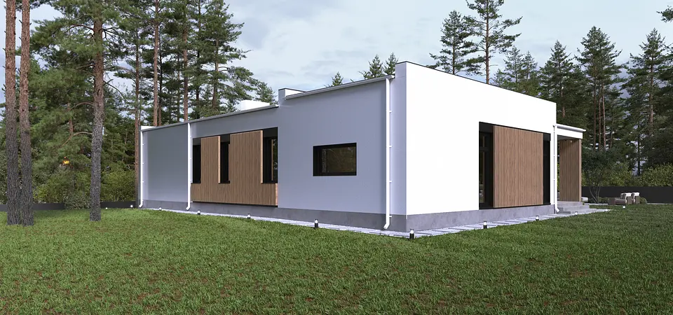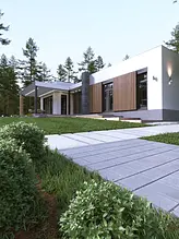 Основная задача стояла при создании данного проекта - оптимальность. Она должна была быть во всем: планировочное решение, интерьер, экстерьер, но не без потери качества и комфорта. Таким образом планировка делится на 3 независимые зоны, в общественной было принято решение увеличить высоту потолков до 3,1 м., а в технической и спальной стандартные 2,8 м. Разный уровень потолков положительно сказалось на экстерьере придав дополнительную пластику. Входная группа была выделена за счет отделки натуральным камнем, придав благородный вид. Деревянный планкен, в виде фасадных вставок, гармонично продолжил тематику "Эко дизайна".