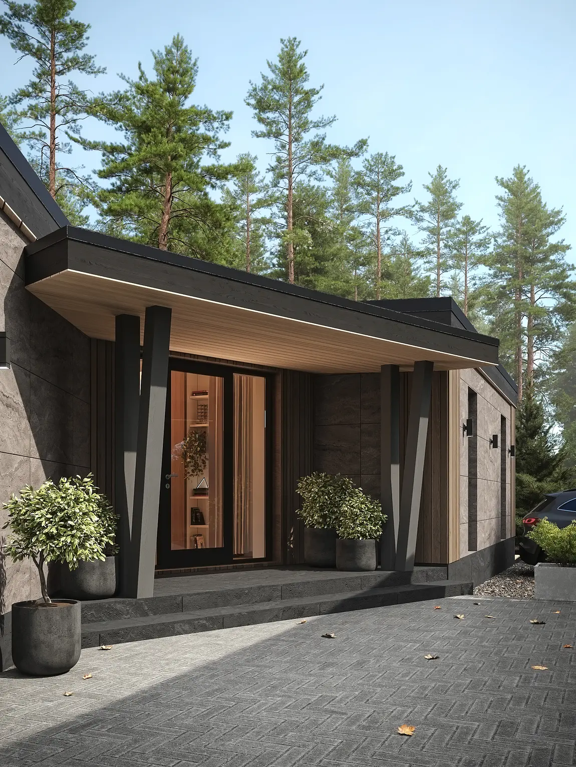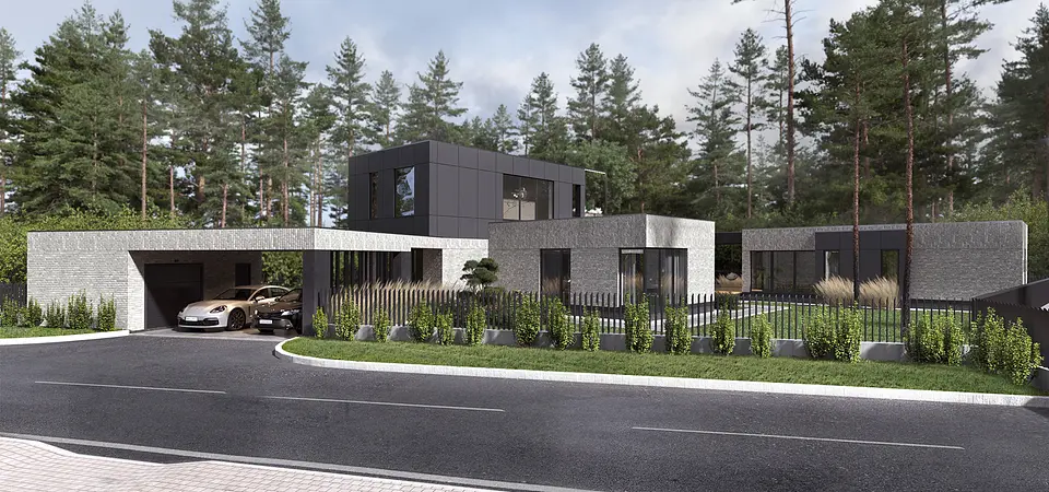 V-victory. Победа над гравитацией и пространством, дом словно парит над участком и уходит в проекцию. Прогрессивный дизайн, иначе не назовёшь. Строение словно теряется в пространстве этого мира, оси большинства стен не параллельны и имеют свой вектор, свое направление. Немного о земном, планировочное решение было сформировано с учетом особенностей участка, в центре которого расположился хвойный собственный участок леса, по этому дом был размещен на дальней стороне. Левый блок, ориентирован на южную сторону, по этому он освещен с самого рассвета и до заката, а большое количество панорамных оконных блоков создают максимальную светопрозрачность. Правый блок ориентирован на северную сторону, окна которого выходят в лес, создавая единение с природой, полностью абстрагируясь от этого мира. Динамику дома повторяет хозяйственный блок и навес на два автомобиля.