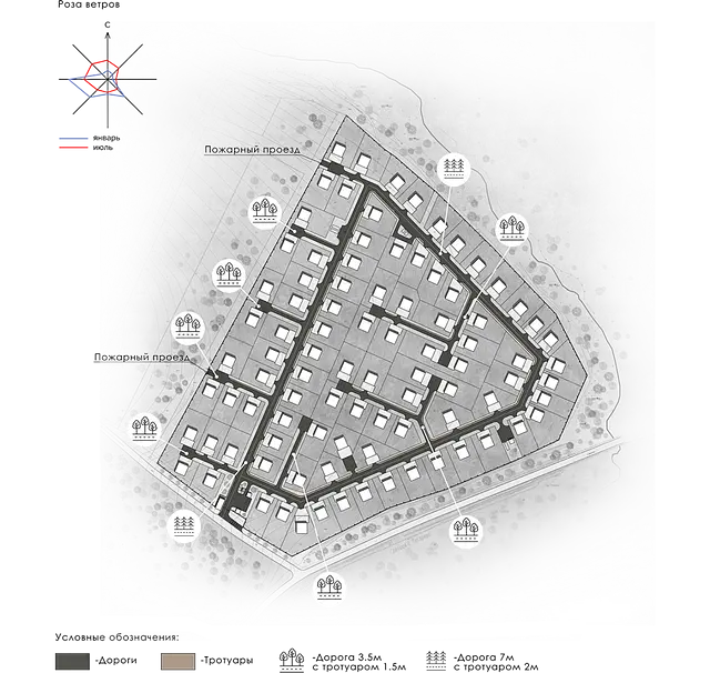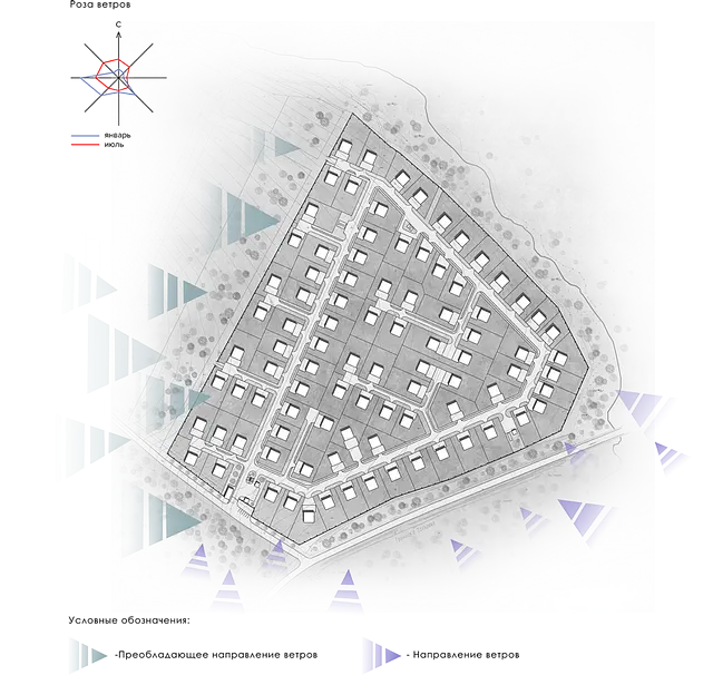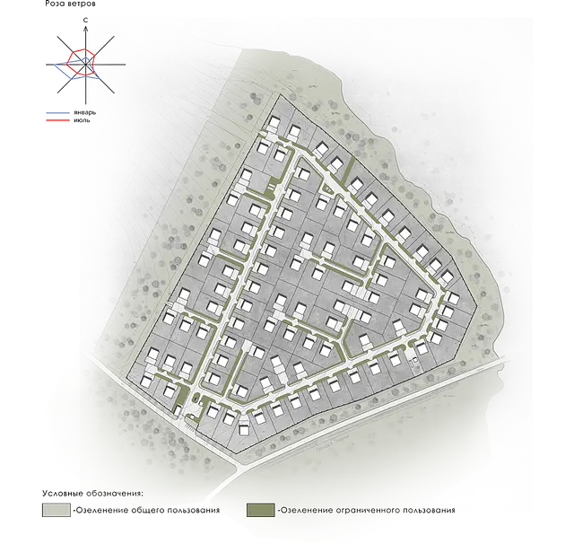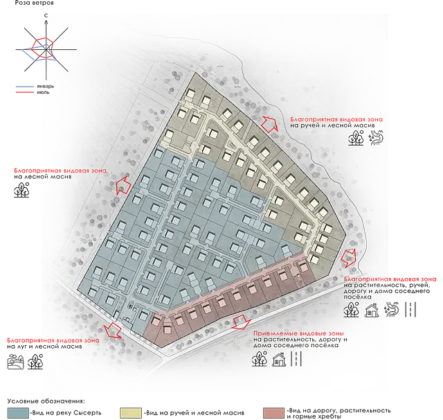 Большим плюсом территории, на которой запроектирован жилой посёлок, являетсято, что она расположена на склоне холма, благодаря этому открываются восхититель ные пейзажи на реку Сысерть и горные хребты.